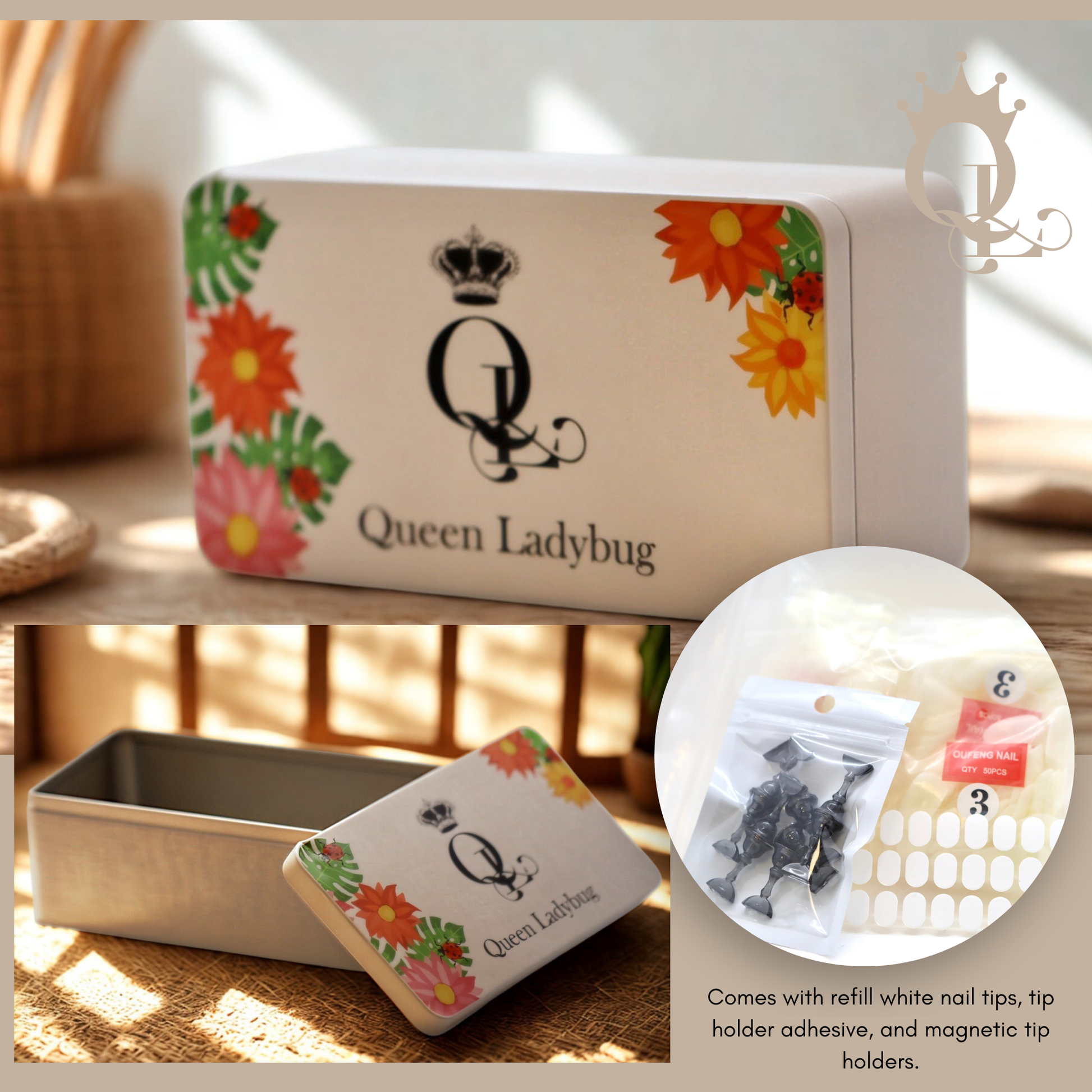 This charming metal “toolbox” is thoughtfully equipped with a set of magnetic tip holders, a bag of white nail tips, and an adhesive sheet for effortless tip placement.